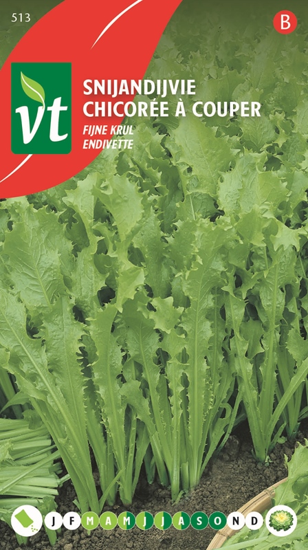 Deze andijvie vormt geen krop. De gekrulde malse blaadjes hergroeien steeds weer opnieuw en er kan gedurende een lange periode van geoogst worden.