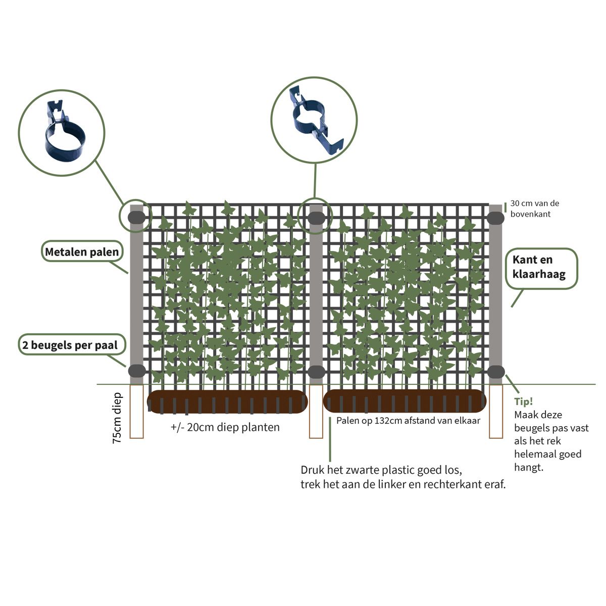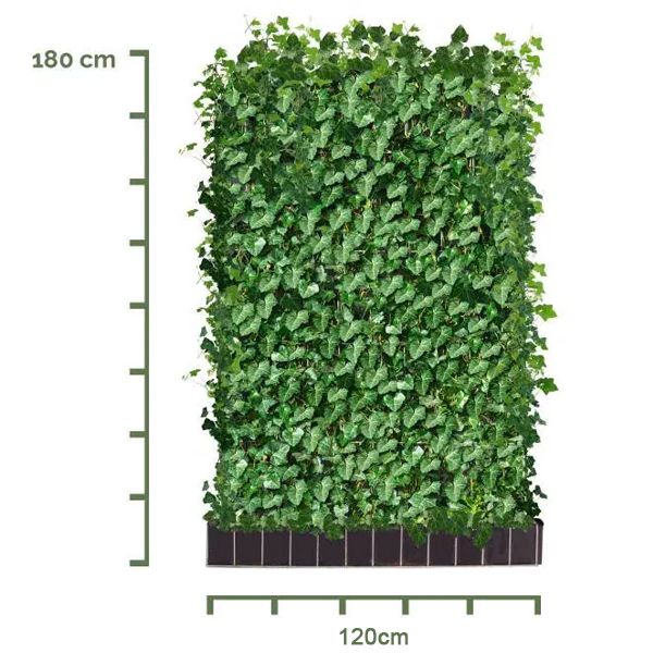 Dit zijn kant-en-klare haagelementen die zorgen voor een directe groene afsluiting. Zeer makkelijk te installeren elementen door middel van stalen palen en beugels. Daarnaast is het ook mogelijk om de haag extra te verhogen, 30 tot 60cm extra, door middel van opzetstukken.