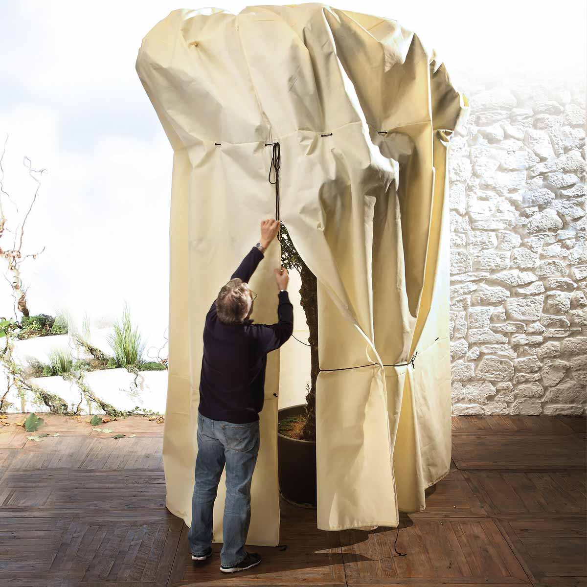 Voor je grotere vorstgevoelige planten en bomen bestaan er GEBRUIKSVRIENDELIJKE WINTERHOEZEN. Deze beschermingshoezen, al dan niet voorzien van een ritssluiting, bieden bescherming tegen zowel extreme koude als een uitdrogende wind. Kies een hoes die goed over je plant zit en wat ruimte vrijlaat. Een te kleine hoes kan gebroken of gescheurde takken opleveren. Op tussentijdse vorstvrije dagen kan u de hoes voor een paar uur openen en tijdens een periode van warmer en windstil weer verwijdert u het best de volledige hoes. Zo krijgt de plant weer wat frisse lucht en licht. Geef water indien nodig.