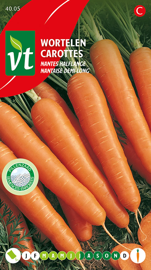 Omhuld zaad (pillenzaad) maakt zaaien gemakkelijker en uitdunnen overbodig. Zaai de pillen in een losse grond, druk ze lichtjes aan en dek af met een dun laagje aarde. Een goede vochtvoorziening is noodzakelijk om een vlotte kieming te bekomen. Nantes is een slanke, goed gekleurde wortel met een stomp uiteinde.